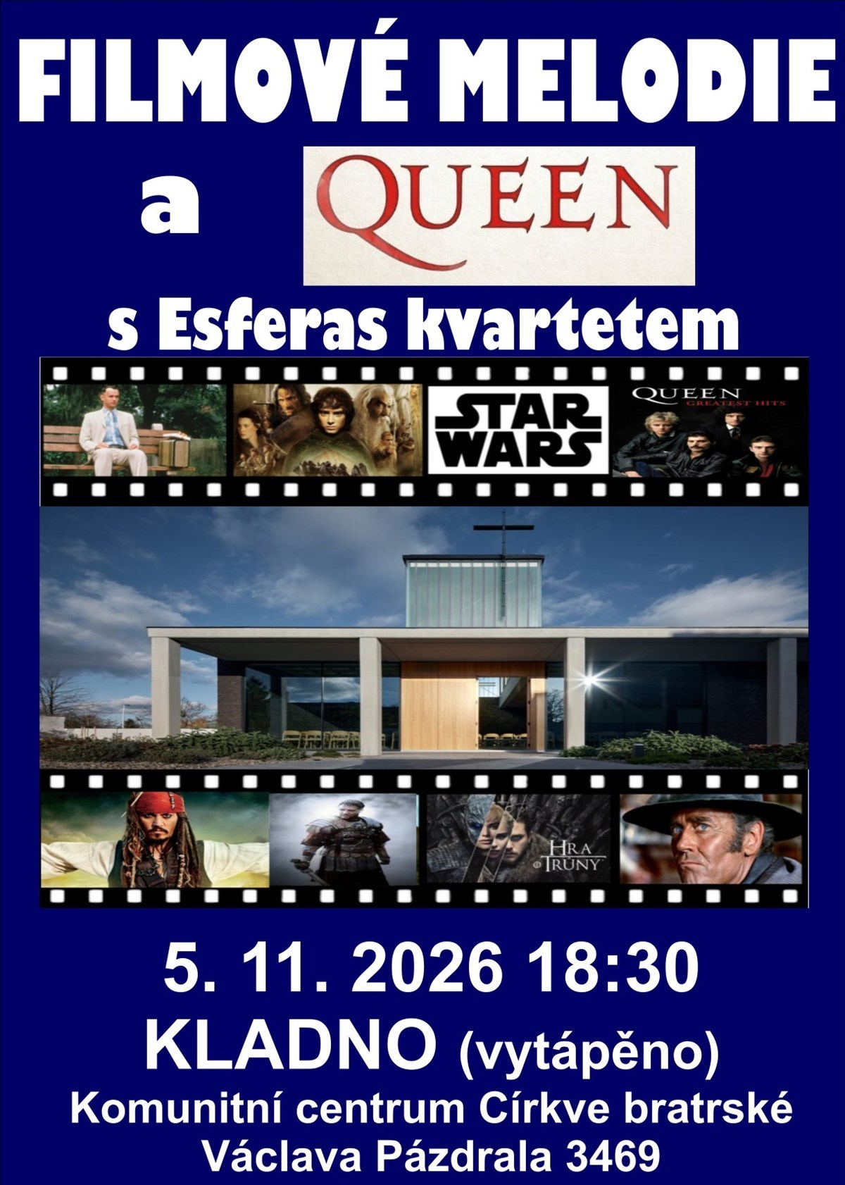 Pojďte si užít zbrusu nový program, který v zajímavé dramaturgii kombinuje aranže 5 písniček skupiny Queen s filmovou hudbou ze známých filmů v úpravě pro Esferas kvarteto do vytápěné moderní budovy Modlitebny církve bratrské v Kladně